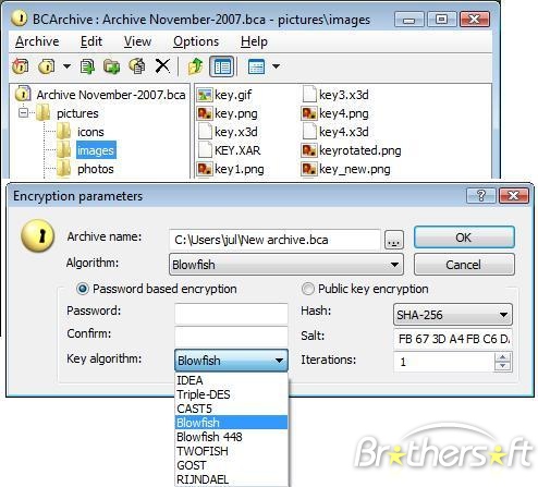 BCArchive komprimuje určené soubory a adresáře s použitím zakódování. Využívá kryptovacích algoritmů jako Blowfish, IDEA, Triple DES, CAST5, hashovacích postupů SHA-1, MD5, RIPEMD-160, a asymetrických algoritmů s veřejným nebo privátním klíčem RSA a ELGamal/Diffie-Hellman.