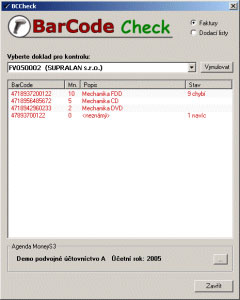 Pomocí této aplikace je možné rychle a pohodlně kontrolovat expedované zboží pomocí čtečky čárového kódu. Stačí vybrat doklad, který chcete zkontrolovat (fakturu/dodací list). Program Vám zobrazí položky dokladu s počty MJ. Následným skenováním zboží se Vám na obrazovce budou postupně odčítat počty MJ u skenovaných položek. V momentě kdy položku naskenujete tolikrát, kolikrát je na dokladu, zobrazí se u položky stav "OK". Pokud naskenujete rozdílný počet MJ bude u položky uveden rozdíl (přebytek/chybějící MJ). Pokud naskenujete nový čárový kód, přidá se nakonec seznamu položek. Program pracuje s každou čtečkou čárového kódu připojenou přes klávesnici.