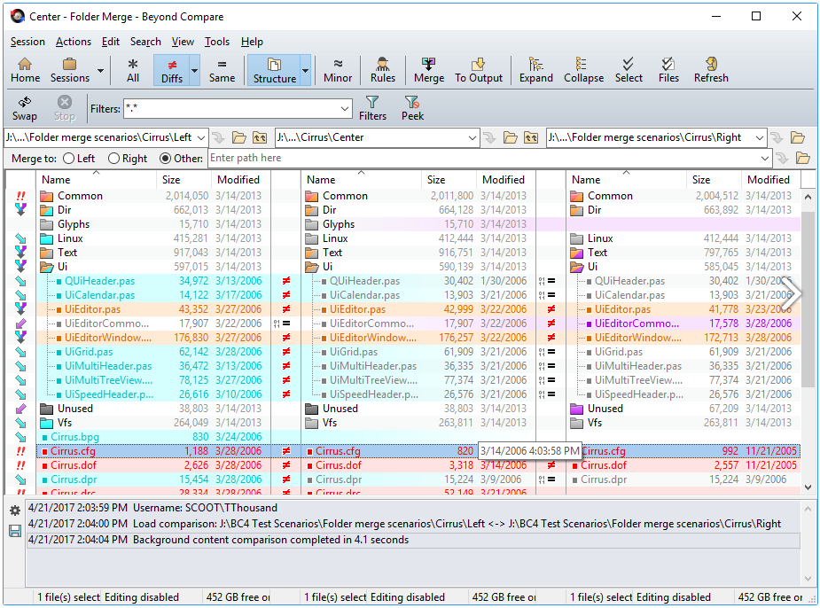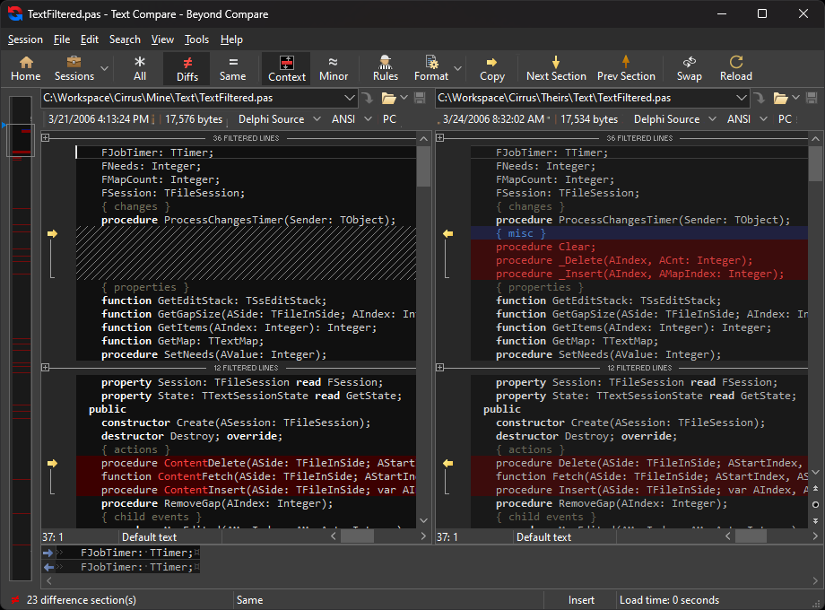Beyond Compare je srovnávací pomůckou pro synchronizaci a porovnání rozdílů a změn souborů a adresářů. Umí přesouvat texty, upravovat je atd. Veliký pomocník pro překladatele při porovnání verzí..