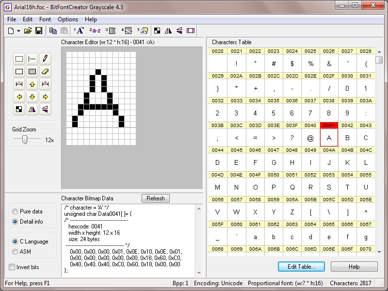 BitFontCreator Grayscale je intuitivní bitmapový nástroj, který slouží k vytváření vlastních fontů. Umožňuje návrh a použití vyhlazených fontů (2-bpp, 4-bpp) pro LCD obrazovky, případně monochromatických (1-bpp). Nástroj obsahuje řadu nástrojů (tužka, guma, kreslení rovných čar, obledlíků apod.). Podporuje ASCII+ISO8859V a Unicode kódování. Nabízí funkce pro export do .fnt nebo .fon souboru, C souboru, případně binárního nebo bitmapového souboru.