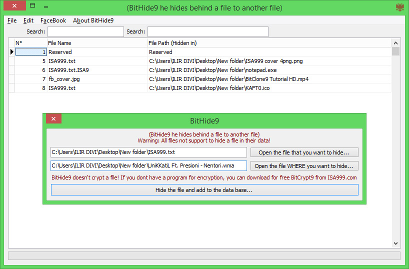 BitHide9 schovává soubory do jiného souboru, pomocí tohoto jednoduchého a uživatelsky přívětivého programu můžete zamaskovat soubor z počítače do jiného lokálně uloženého souboru. BitHide9 byl vyvinut, aby nabídnul přímý způsob, jak utajit Vaše nejcitlivější dokumenty do jiných souborů, aby byly méně viditelné pro potenciálně nežádoucí lidi, kteří používají stejný počítač jako Vy. Výhodou je i nastavení jednoho nebo více účtů. Při prvním spuštění aplikace budete požádáni o registraci nového uživatele zadáním uživatelského jména a hesla.