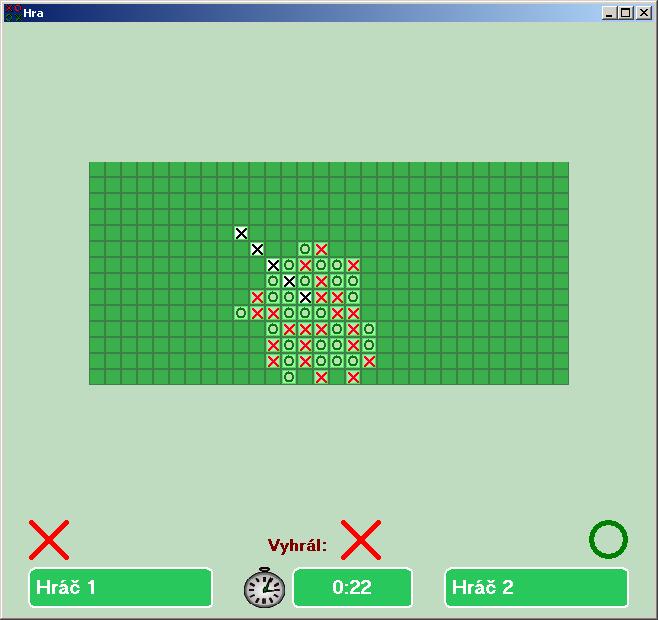 Hrát proti sobě mohou 2 hráči nebo hráč a počítač na poli o rozměru nxn, kde n je rozměr pole(5-30). Zkuste své štěstí třeba právě vám se podaří zvítězít, jde to a ani to nedá tolik práce!