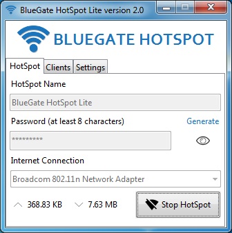 S BlueGate HotSpot, můžete přeměnit svůj počítač na skutečný WiFi hotspot a s jeho pomocí tak sdílet internetové připojení jako Wi-Fi připojení. BlueGate je velmi jednoduchý a uživatelsky přívětivý software, který promění váš počítač s OS Windows 7/8 / 8,1 na Wi-Fi hotspot snadno a rychle.