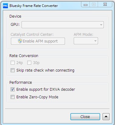 Bluesky Frame Rate Converter je DirectShow filtr. Pomocí něho lze převést snímkovací frekvenci videa využitím GPU, provedením interpolace snímků. Zajištěna kompatibilita s AMD Fluid Motion Video a podporuje několik modelů - Radeon R9/R7 Series, Radeon HD 7000 Series a Kaveri, případně novější APU.Nabízí podporu pro Intel Haswell a novější iGPU, ovšem jen pod Windows 7. Filtr je schopen interpolací snímků převést 24p na 60p nebo 30p na 60p.