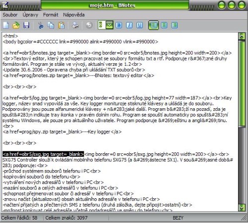 BNotes je jednoduchý textový editor o něco lepší než notepad a o něco horší než wordpad. Podporuje formátování textu, zobrazování počtu a řádků ve stavovém řádku, zalamování řádků... prostě standard. Ukládání je možné ve formátech TXT a RTF. Bohužel zatím nevím jak udělat aby se TXT a RTF soubory otevíraly v BNotes automaticky, tak to budete muset udělat ručně: klikněte pravým tl. myši na soubor TXT/RTF, dejte otevřít v programu -> zvolit program. Tlačítkem procházet najděte a zvolte BNotes a zatrhněte "K otevření souborů tohoto typu vždy použít vybraný program".