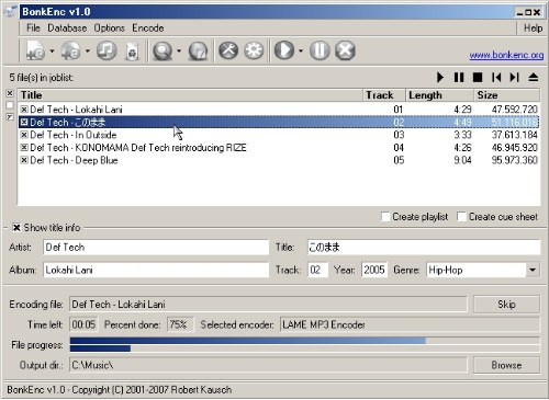 BonkEnc je výkonný nástroj na ripování CD a konvertor mnoho formátů. Program umožňuje pracovat s formáty: MP3, MP4/M4A, Ogg Vorbis, AAC, Bonk a FLAC. Podporuje: