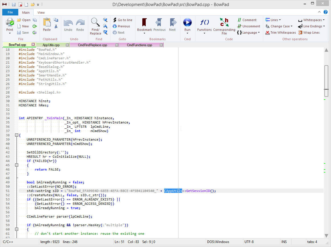 BowPad je editor zdrojového kódu, ve kterém lze otevřít a rozpoznat širokou škálu typu souborů, včetně těch, psaných v HTML, Perl nebo C ++. Aplikace také přichází s šikovným trikem, který Vám umožní vybrat jedno nebo více slov v kódu a provést vyhledávání termínu na internetu. Dokonce si můžete vyhledat přímo na Wikipedii to, co budete potřebovat.