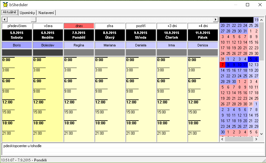 bSheduler je jednoduchý a užitečný kalendář podobný tomu v Microsoft Outlooku. Události mohou být ukládány s různým časovým opakováním. Projeví se samozřejmě zobrazením zprávy, ale umí také spustit program. U každého dne je zobrazeno jméno, které má svátek.