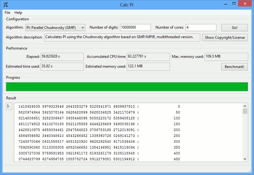 CalcPi je program, který počítá Pí a další matematické konstanty s libovolnou přesností na desetiná místa. Omezení výpočtu je pouze na výkonu a paměti.