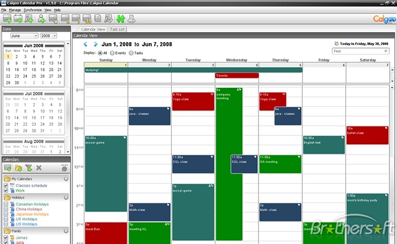 Calgoo Calendar má možnost ovládání vícenásobného kalendáře, plánovače, kontakty a úkoly online nebo offline. Má možnost synchronizovat s Google, Outlook, iCal formáty.