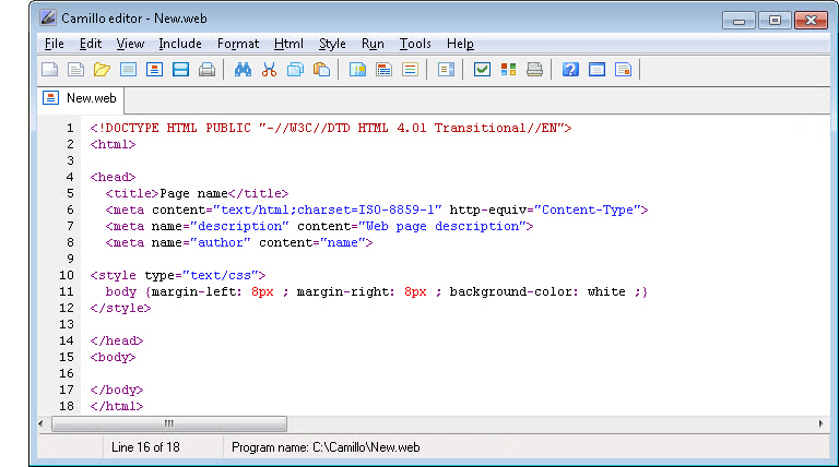 Camillo editor je jednoduchý, ale výkonný HTML editor pro Windows. S tímto editorem můžete prohlížet a editovat HTML soubory. Obsahuje funkce pro zjednodušení práce, speciální znaky, tabulky, formuláře, hypertextové odkazy, obrázky atd. K upravení můžete použít grafické efekty. Program podporuje i ostatní typy souborů související s vývojem webových stránek: WEB, HTML, TEM, CSS, JS, JAVA, TXT nebo DOC.