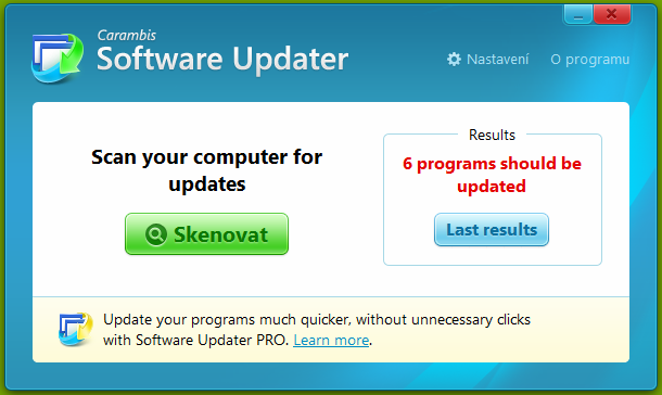 Carambis Software Updater je univerzální nástroj pro aktualizaci programů. Po spuštění Vám najde nejnovější aktualizace, které jsou k dispozici pro všechny programy běžící na vašem počítači. Unikátní skenovací algoritmus rychle analyzuje data o každém zastaralém softwaru ve vašem počítači a okamžitě zobrazí seznam programů, které je možné aktualizovat. Tento program funguje jen jako skener. Věnujte pozornost instalačnímu procesu, jelikož se zde vyskytují produkty třetích stran.
