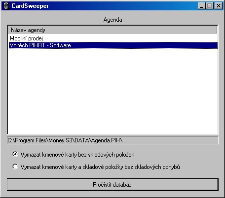 CardSweeper je program, který Vám zkontroluje vybranou agendu a nabídne odstranění záznamů z databáze skladových zásob (sksezzas) se kterými nebyl proveden žádný pohyb (ve všech letech). Druhá volba nabízí odstranění kmenových karet (skkmkart), které nejsou umístěny na žádném ze skladů (uživatelé často vymažou kartu ze skladu, ale již ne z kmenových karet).