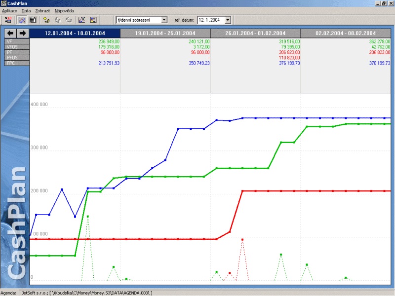 CashPlan pracuje v režimech denního, týdenního a měsíčního srovnání a dokáže zobrazit až 7 období současně včetně grafického zobrazení.