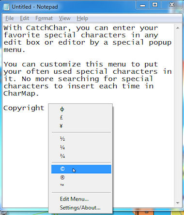 CatchChar je jednoduchý nástroj pomocí kterého můžete vstoupit do kontextového menu s nabídkou často používaných znaků, frází či slov. Menu zobrazíte klávesovou zkratkou Alt-Shift-C v jakémkoli textovém boxu. Poslední znak klávesové zkratky je modifikovatelný. Kliknutím na konkrétní znak dojde k vložení do textového boxu. Nabídka CatchChar začíná s velmi málo výchozími znaky. Předpokládá se, že byste chtěli přidat své vlastní.