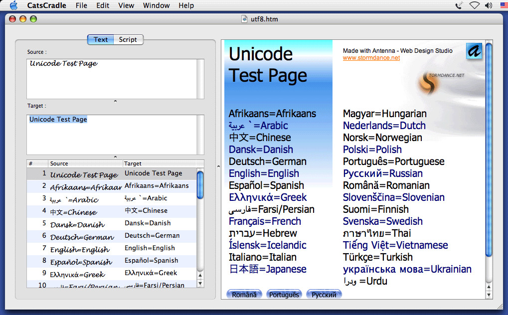 CatsCradle nabízí plnou podporu Unicode, takže můžete snadno provádět lokalizaci webových stránek v azbuce, řečtině, thajštině, čínštině a japonštině.