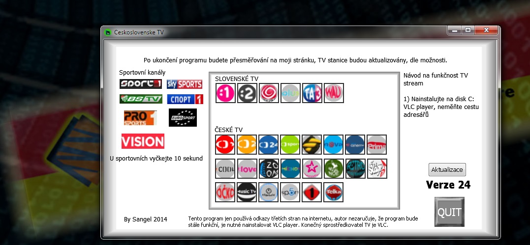 Československé TV Vám snadno zprostředkuje volně dostupný televizní stream v internetu. Obsahuje základní programovou nabídku českýc a slovenských televizních stanic. Jistě uvítáte, že neobsahuje žádnou reklamu, ale odkazuje jen na stránku autora. Kromě výše zmíněné nabídky obsahuje i několik sportovních programů. Pro správnou funkčnost programu musíte mít nainstalován VLC player.