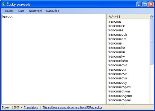 Po otevření programu dvojklikem myší na jeho ikonu vybereme příslušný slovník z menu "Data". Pokud se Vám písmena při psaní do editoru zdají příliš malá, lze použit "Zoom" ve "statusbaru". Pak již můžeme začít psát text do levého editoru po jeho aktivaci kliknutím kurzorem myši do jeho prostoru. Program bude vyhledávat slova začínající znaky slova, které jste již napsali a bude je vkládat do "seznamu" v pravé části aplikace. Zde si pak můžeme ověřit správnost námi psaného slova a, nebo jej vložit do textu kliknutím kurzorem myši na požadovanou položku v "seznamu" nabízených slov.