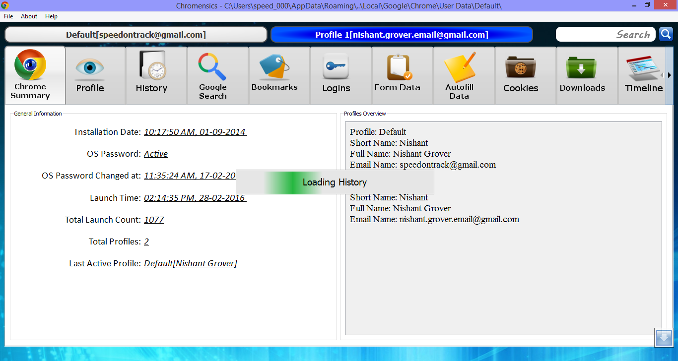 Chromensics dokáže zjistit všechny potřebné informace, které jsou uloženy v adresáři internetového prohlížeče Google Chrome. Nástroj umožňuje vyhledávat a řadit záznamy, generovat PDF reporty, vypsat historii procházení, histori stahování atd.