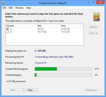 CodeInventors WipeFS je nástroj pro tzv. vyčištění nevyužitého prostoru na pevném disku i externích paměťových zařízeních. Klasický způsob mazání souboru neznamená že, je soubor opravdu odstraněn, tudíž je potřeba jednotlivé bity přepsat, aby byly smazány všechny stopy a soubor tak nemohl být obnoven.