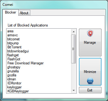 Comei Blocker je výkonný správce procesů, který vám pomůže skončit s nežádoucími aplikacemi. Po spuštění na pozadí sleduje systém a okamžitě ukončuje aplikace, které vám překáží. Comei Blocker je snadno použitelný a umožňuje vám spravovat černou listinu aplikací, které chcete zastavit. Můžete přidat konkrétní aplikace nebo masky souborů, jako jsou keyloggery, hry a další. Comei Blocker také umožňuje nastavovat spouštění aplikací pouze v případě, že jsou autorizovány vybraným uživatelem. A konečně, můžete ukončit nežádoucí aplikace ručně, jednorázově.