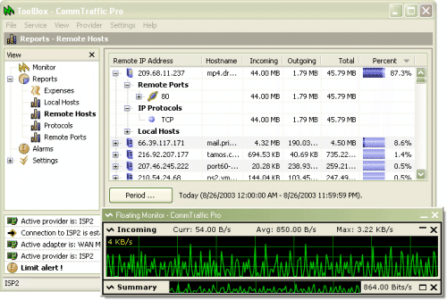 CommTraffic tento program monitoruje internetové nebo LAN připojení, zobrazuje tok dat a zpracovává je. Sleduje také provoz na síti a sestavuje statistiky síťové komunikace každého připojeného počítače a přenosu dat.
