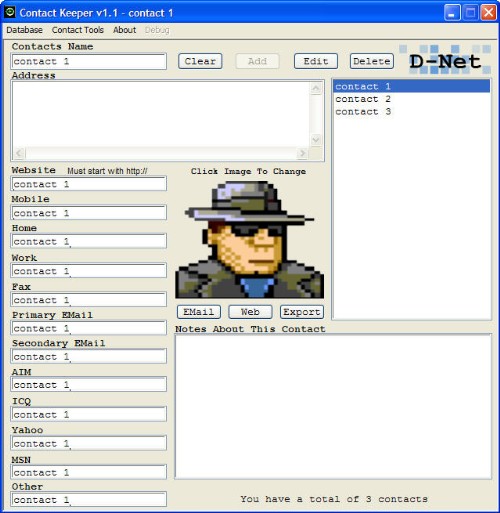 Contact keeper je jednoduchá aplikace pro organizování kontaktů. Každý kontakt obsahuje: jméno, adresa, telefonní číslo, emailová adresa, icq kontakt, vlastní poznámku atd. Všechny informace jsou ukládány do šifrované databáze.
