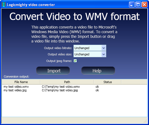 ConvertToWMV bezplatná aplikace pro Windows umožňující konvertování téměř jakýchkoliv video souborů do Microsoft's Windows Media Video (WMV) formátu. Poskytuje intuitivní a přehledné uživatelské rozhraní. Klikněte na tlačítko import nebo přesuňte video do okénka. Nabízí také možnost změnit výstupní velikost videa a bitrate.