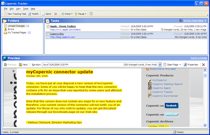 Copernic Tracker automaticky vyhledá nový obsah na webových stránkách, tak často, jak budete chtít. Pokud je detekována změna, tento software vás na ni upozorní prostřednictvím e-mailu, včetně kopie webové stránky se zvyrazněnými změnami, nebo tím, že zobrazí upozornění na ploše.