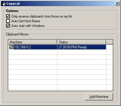 Copycat je zajímavá aplikace, která pracuje se schránkou. Umožňuje zpřístupnit obsah schránky (clipboard) na více počítačích. Stačí vybrat adresy počítačů v síti, se kterými bude schránka sdílena. Podmínkou je, že i na ostatních počítačích musí běžet Copycat.