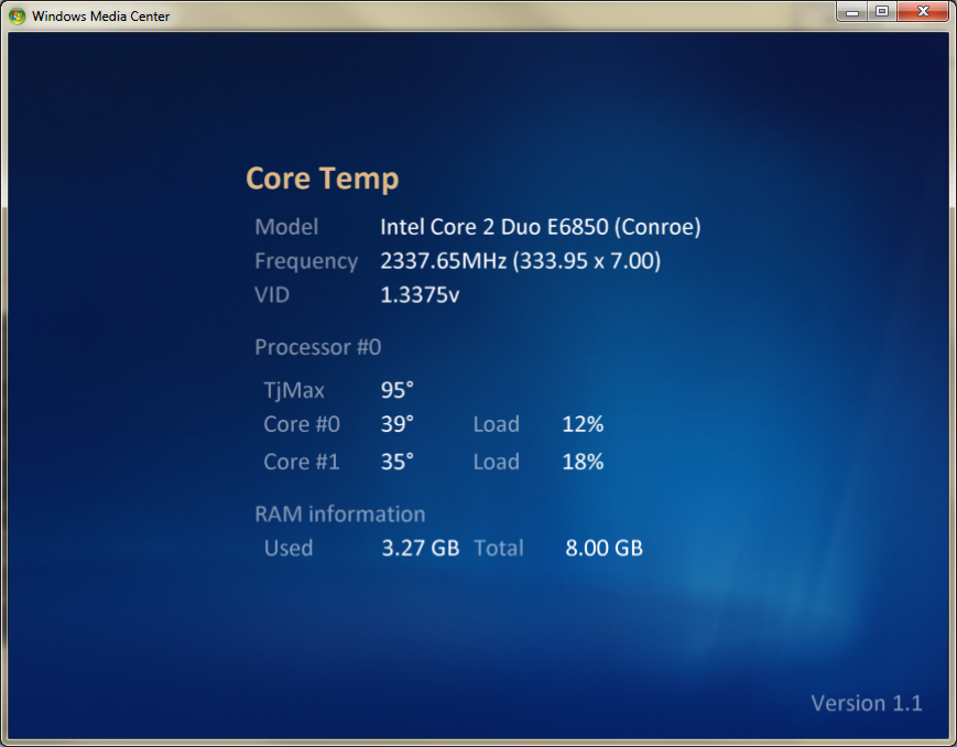Core Temp MC je doplněk Windows Media Center, který umožňuje uživateli zobrazit stav jejich procesoru přímo z uživatelského rozhraní Windows Media Center.