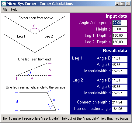 Corner je program pro výpočet parametrů jednotlivých rohů a úhlů výrobků z různých materiálů: hliník, ocel, sklo, atd. Program zobrazuje hrany výrobku a jejich parametry. Uživatelské rozhraní je intuitivní a přehledné.