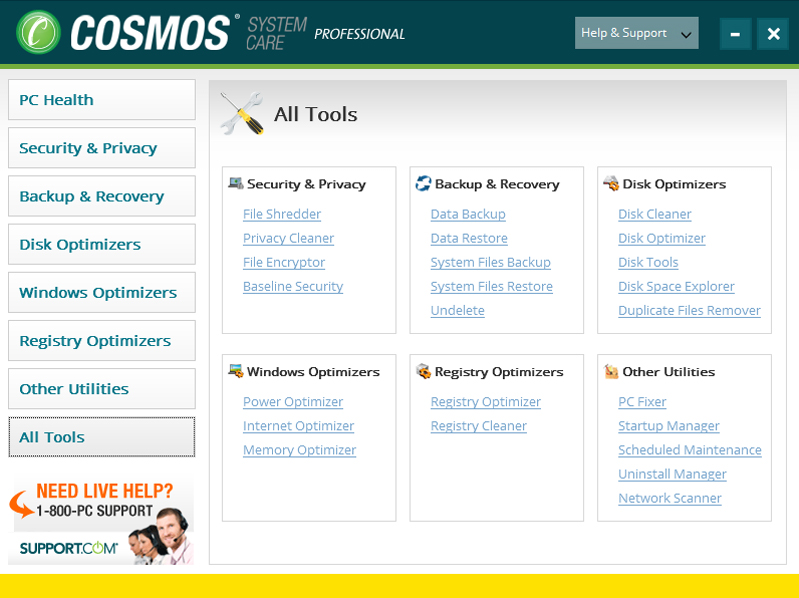 Cosmos System Care - Professional Edition se skládá ze 24 užitečných nástrojů seskupených do různých kategorií, jako jsou: Bezpečnost a soukromí, Zálohování a obnovení dat, Optimalizace registru a optimalizace Windows. Všechny tyto nástroje spolupracují s cílem optimalizovat, vyčistit a opravit počítač.