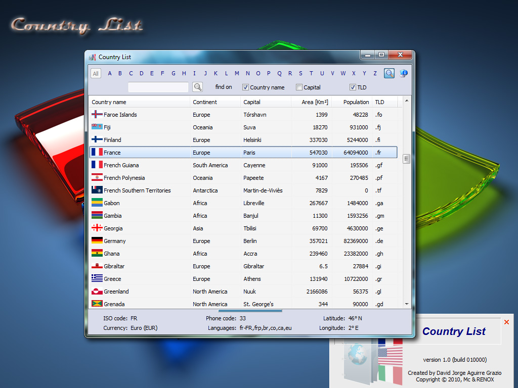 Country List je kompletní databáze všech zemí na světě, jejich vlajky, hlavní města, kontinenty, oblasti, populace, internetové domény nejvyšší úrovně (TLD), ISO kódy, zeměpisné souřadnice, jazyky, měny a kódu telefonu. Má také vyhledávací nástroj, který usnadňuje najít, co potřebujete.