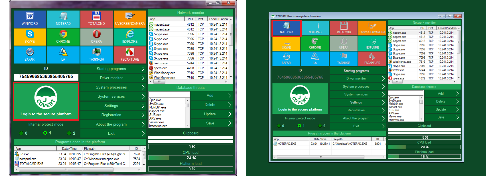 Covert Pro poskytuje důvěrnou ochranu při práci na jednom počítači s použitím všech oblíbených programů, bez zanechání jakýchkoli stop. Program tedy zajišťuje maximální soukromí a anonymní surfování na internetu. Můžete také sledovat výkon systému a procházet seznam aktivních ovladačů, procesů a služeb.