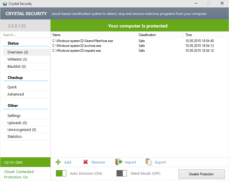 Crystal Security je systém, který detekuje a odstraňuje škodlivé programy (malware) z vašeho počítače. Jeho technologie poskytuje rychlou detekci proti malwaru a umožní vám vědět o změnách ve vašem počítači v reálném čase. Program je pouze doplněk k plnohodnotnému antiviru. Má jednoduché prostředí a je možné si zvolit vámi požadované nastavení např. ochrana heslem, tichý mód, automatické rozhodování, spouštět jako admin, automatické aktualizace apod.