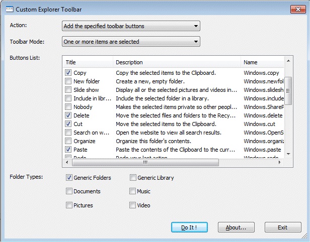CustomExplorerToolbar je určený pouze pro Windows 7 a umožní snadno přizpůsobit panel nástrojů programu Průzkumník Windows a přidat tlačítka, které se vyskytovaly v předchozích verzích systému Windows, jako je kopírování, vyjmout, vložit, Vybrat vše a mnohem více. Tento nástroj umožňuje odebrat tlačítka na panelu nástrojů, které jste přidali.