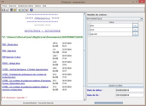 CVSelector je software, který umožňuje provést výběr souborů z určitého počtu zadaných kritérií. Nejjednodušším příkladem je výběr životopisu z klíčových slov. Uživatel určuje složku, která obsahuje všechny dokumenty (databázi CV). Podporuje několik vstupních formátů (DOC, DOCX, PPT, PPTX, RTF, XML, ODF, HTML, PDF). Je jednoduchý na použití a podporuje také 15 světových jazyků.