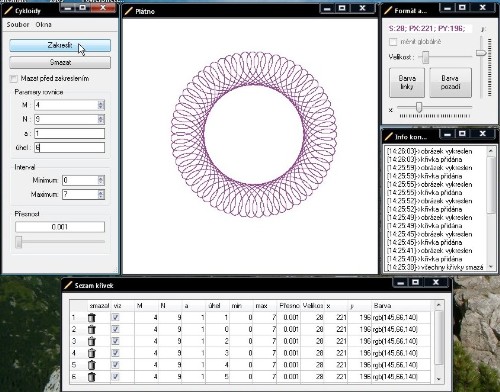 Program slouží k automatickému generování křivek (cykloidů), za pomoci matematických rovnic, jejichž parametry jsou zadávaný pomocí formulářového prostředí (vis. dokumentace ).