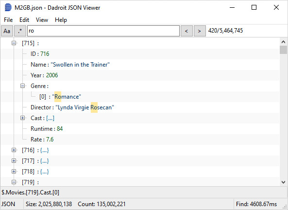 Dadroit JSON Viewer je program pro procházení a prohlížení velkých datových souborů ve formátu JSON. Umožňuje zobrazovat data ve stromové prezentaci, což usnadňuje navigaci a pochopení datové struktury. Program také umožňuje provádět dotazy na data, což usnadňuje hledání konkrétních dat. Je to rychlý a efektivní nástroj pro práci s velkými datovými soubory JSON.
