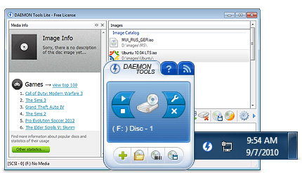 DAEMON Tools Lite jeznámý emulátor virtuálních CD/DVD mechanik který zvládá emulovat skoro všechny známé ochrany proti kopírování. Celý program se ovládá pouze pomocí ikonky vedle systémových hodin, umí simulovat až 5 mechanik, podporuje typy souborů cue/bin, iso, ccd (CloneCD), bwt (Blindwrite), mds (Media Descriptor File), cdi (Discjuggler), nrg (Nero), pdi (Instant CD/DVD), b5t (BlindWrite 5).