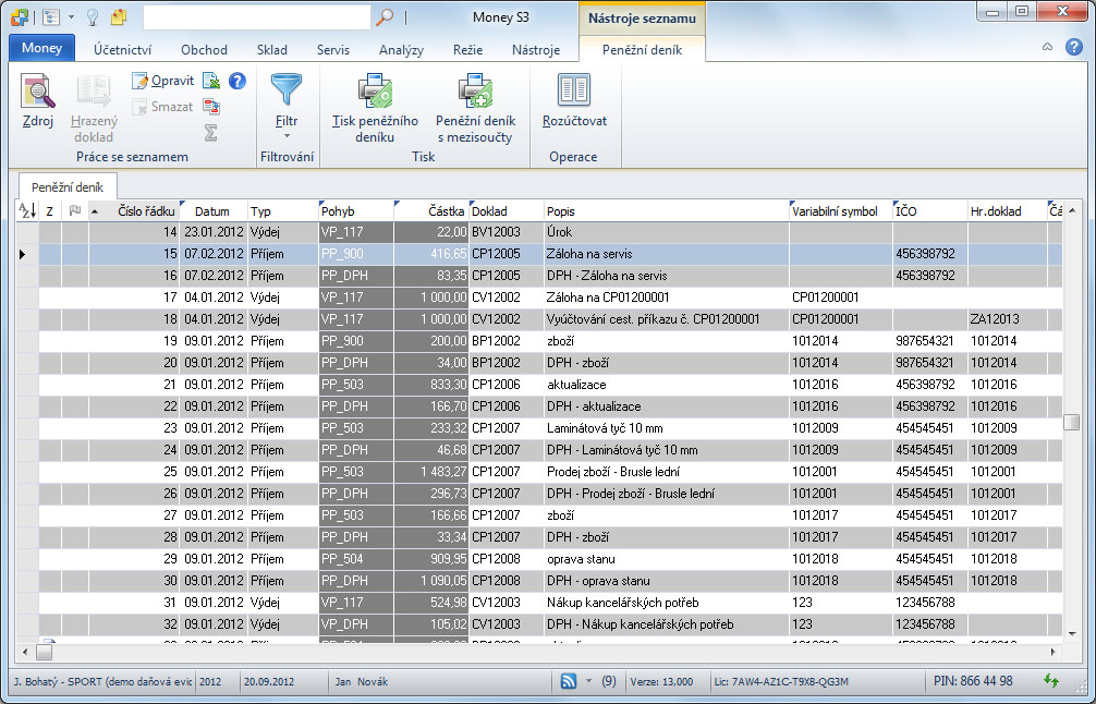 Při práci s deníkem si můžete vytvořit databázi opakovaných zápisů (např. soc. a zdrav. pojištění apod.) a každý sloupec můžete navíc podrobně členit, čímž získáte přehled o všem, co potřebujete sledovat. Přímo při zápisu můžete také tisknout příjmové a výdajové doklady se všemi náležitostmi. K dispozici máte též tisk pokladny a tisk banky (přehledy operací v pokladně či vybrané bance za libovolné období včetně aktuálních zůstatků) - slouží pro kontrolu úřadů i vlastní přehled. Kdykoliv můžete cokoliv opravit a vše se automaticky přepočítá. Zapisovat do deníku se dá průběžně nebo ho lze sestavit i za delší období.