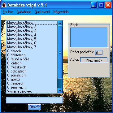 Databáze vtipů je program, pomocí kterého si můžete pohodlně číst vtipy či dokonce vytvářet své vlastní databáze plné vašich oblíbených vtipů, což může později vést až k populární sbírce "českých" vtipů . V balíku najdete databázi s cca. 1.500 vtipy, které vytvořil Petr Levý.