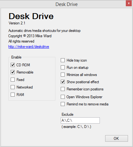 Desk Drive je nástroj, který dokáže přidávat zástupce na USB disky, výměnné jednotky a optické mechaniky na pracovní plochu. Po připojení USB disku nebo po vložení média do optické mechaniky se na pracovní ploše automaticky vytvoří zástupce. Umožňuje tedy okamžitý přístup k vašemu obsahu. Pokud je disk či médium odebráno, zástupce bude z plochy automaticky odstraněn. Nezabírá tedy zbytečně cenné místo na ploše jako tomu je v případě běžného zástupce.