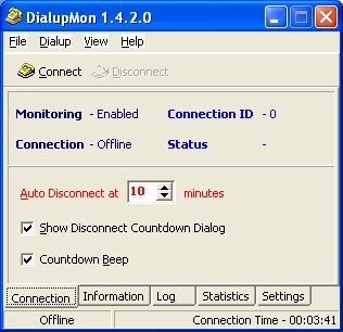 DialupMon je malá a šikovná pomůcka, která vás po zadaném čase odpojí z internetu. V určeném čase se zobrazí okno s nabídkou odpojení, pokud si vyberete Cancel (zrušit), můžete dále pokračovat v surfování a okno programu se vám zobrazí znovu později. Pokud nejste zrovna u počítače, když vás program upozorní a nabídne odpojení, automaticky odpojí připojení. DialupMon také zobrazuje všechny informace o připojení.