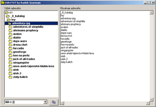Program, který zobrazuje v pravé části seznam podadresářů vybrané složky jako obyčejný text. To se hodí pro použití v textových ediotorech, například potřebujete-li získat seznam složek z adresáře MP3 a nechcete je opisovat ručně - jednoduše text jen vyberete a skopírujete do schránky příkazem CTRL+C.