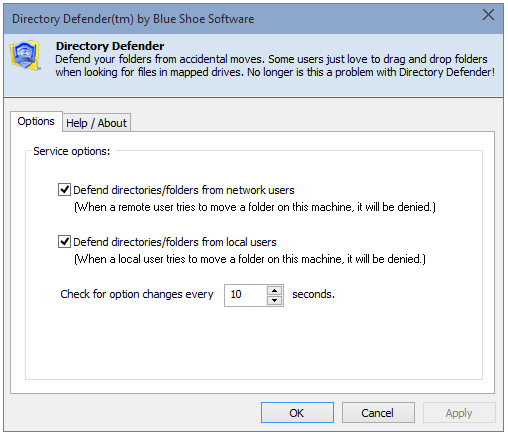 Directory Defender je praktické a uživatelsky příjemné softwarové řešení, vytvořené s cílem zajistit znemožnění náhodného přemístění složky na vašem "File Serveru" nebo ve vašem počítači. Program se instaluje rychle, což Vám umožní ihned po konfiguraci, těžit z jeho funkcí co nejdříve. Po definování provozu a parametrů, bude Directory Defender monitorovat pohyby všech složek, sledovat výskytu a zobrazení chybové zprávy, kdykoliv se ji někdo pokusí přesunout.