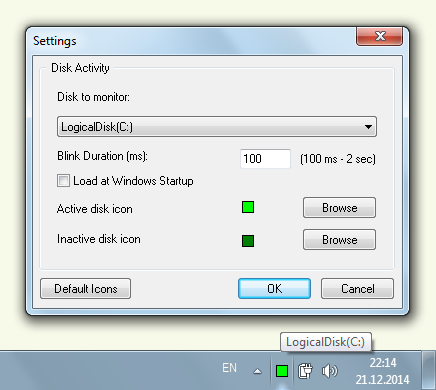 Disk Activity Indicator může být užitečný, pokud Váš počítač nemá HDD LED (laptop / ultrabook) nebo pokud jste připojeni ke vzdálenému počítači pomocí RDP nebo aplikací VNC / RFB. Při otevřeném dialogovém okně Nastavení můžete vybrat, které z logických nebo pevných disků chcete sledovat, poté určete interval aktualizace a na závěr si přizpůsobte ikonu.