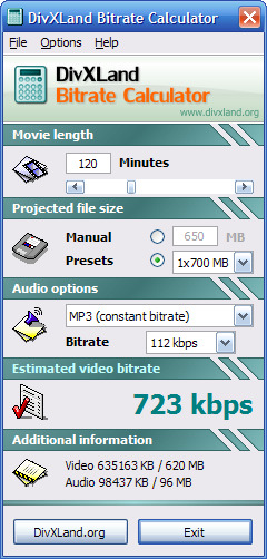 Upravujete video, nebo soubory a potřebujete vědět, před započetím převodu, jaká bude výsledná velikost souboru? Není snad nic snažšího, než díky této kalkulačky zvolit žádané parametry (délka filmu, požadovaná velikost, požadovaný audio kodek atd.) a program vám vypíše bitrate (velikost datového toku), kterým byste měli video převádět, abyste se vešli do vaši žádané velikosti.