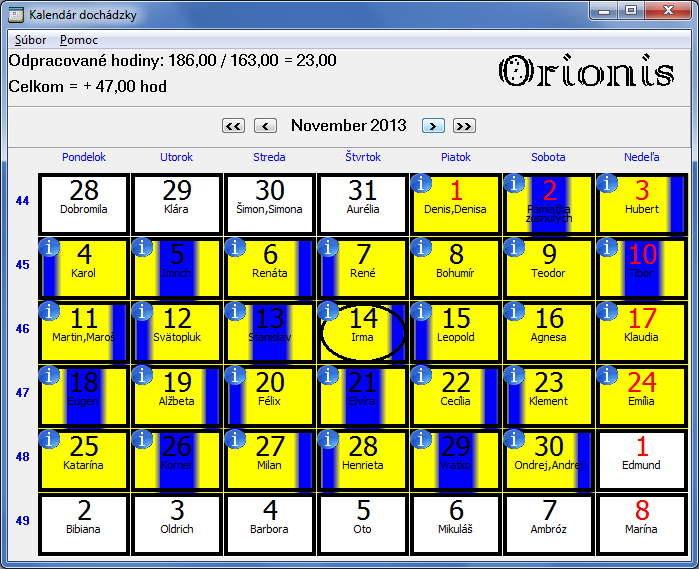 Program slouží k zaznamenávání docházky s nepravidelnou pracovní dobou. Má možnost zadávat různé druhy volna. Daný uživatel má super přehled o tom, kdy má kolik přesčasu nebo kolik hodin mu chybí do naplnění pracovního fondu. Pro veškerý druh volna má možnost nastavit si vlastní barvu. Pracovní fond si může nastavit sám nebo použít zadaný aplikací a stačí nastavit pouze počáteční datum.